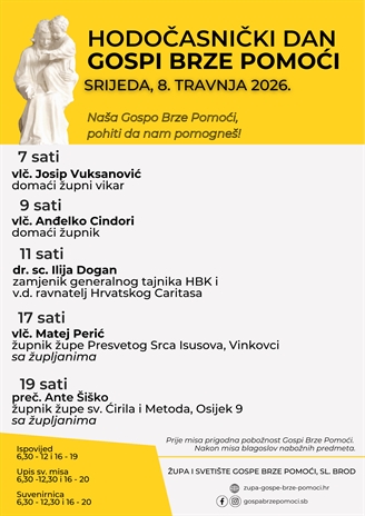 Hodočasnički dan Gospi brze pomoći, travanj 2026.